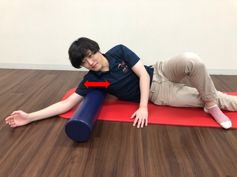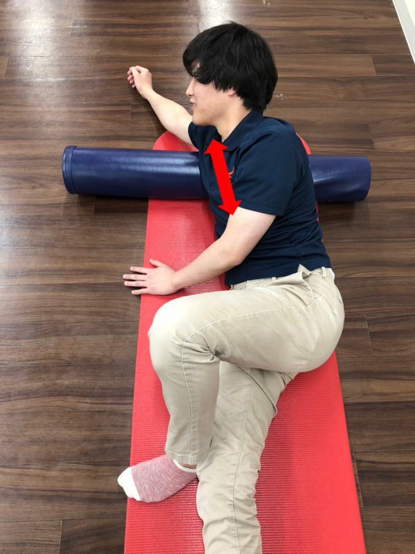 ②下側の腕を上げ、脇の下辺りにストレッチポールを横向きで置きます。
