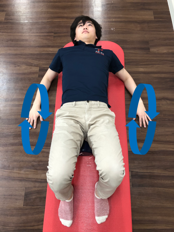 ③両腕で体を支えながらゆっくりと仰向けに寝ます。