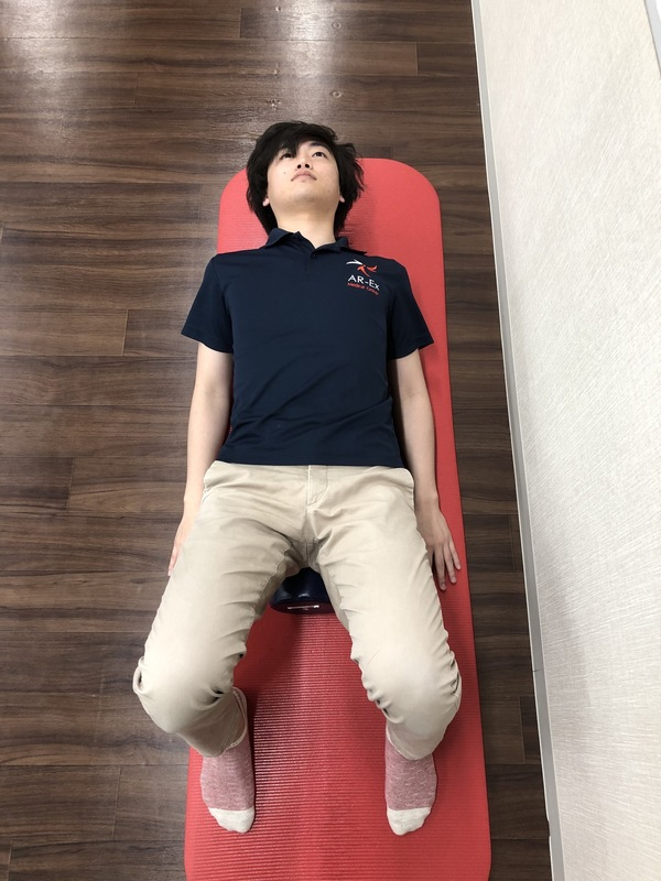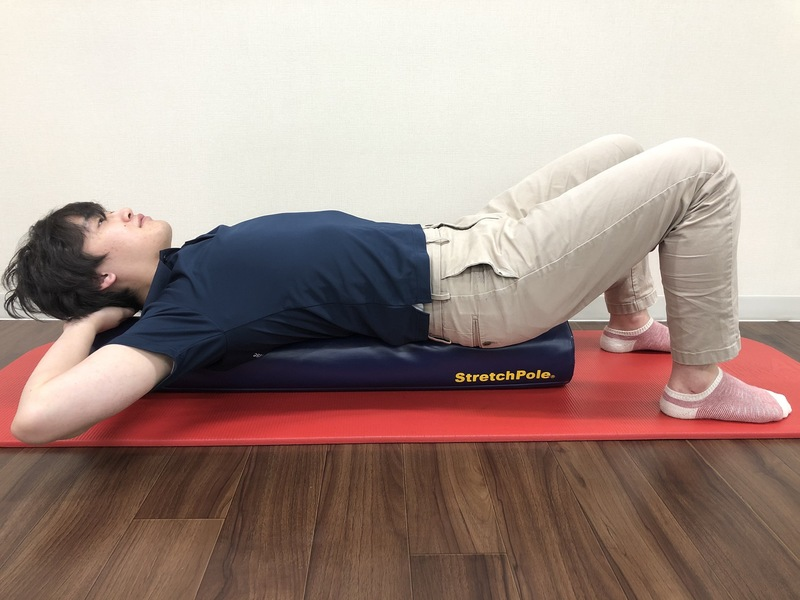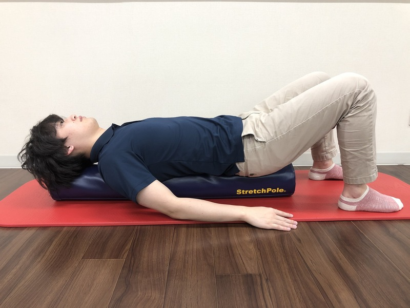 基本姿勢:お尻から頭までしっかりとストレッチポールに乗せ仰向け寝ます。