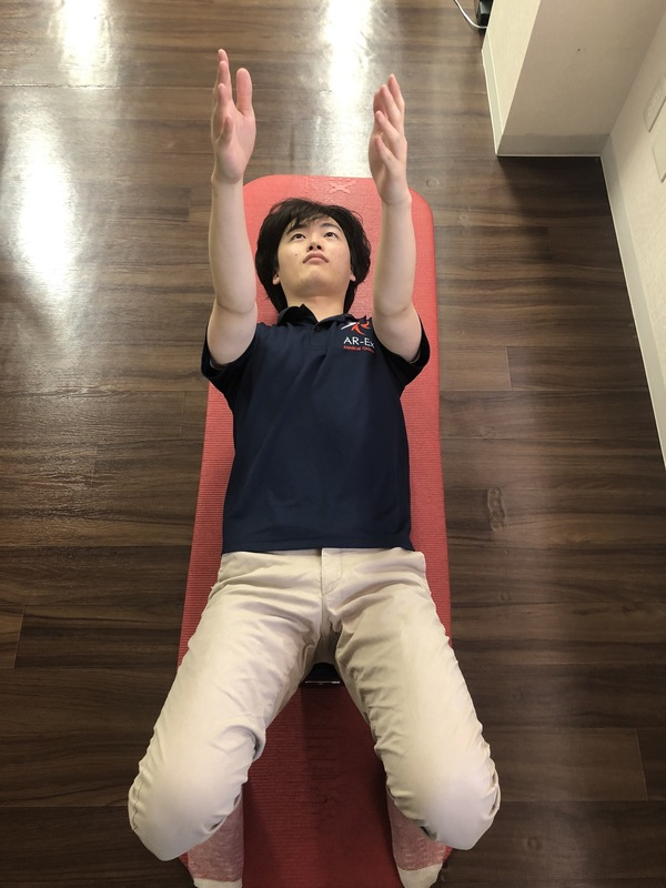 ②その状態から指先で天井を触るように肩甲骨から前方へ突き出します。