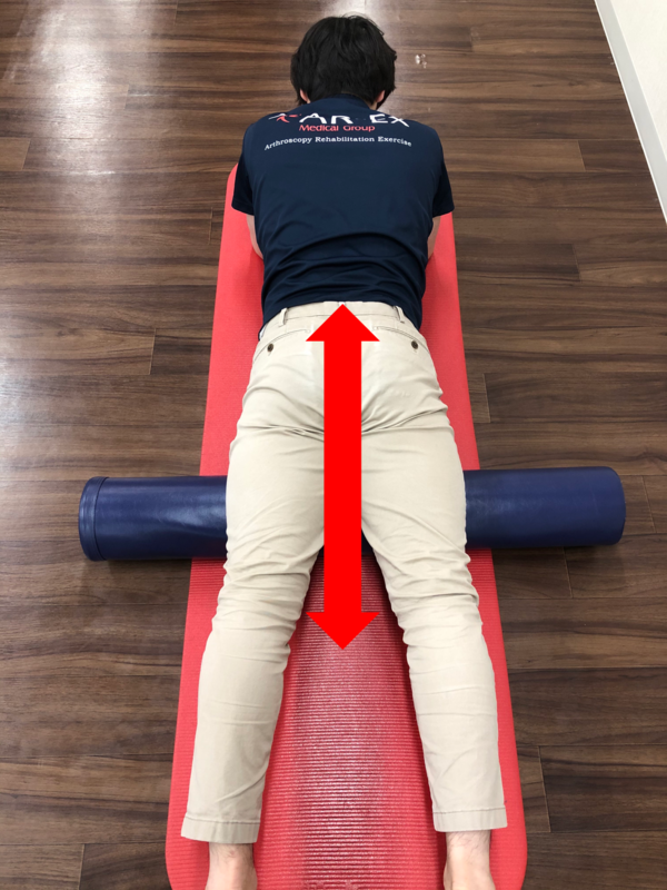 ②太ももの下にストレッチポールを横向きに置きます。
