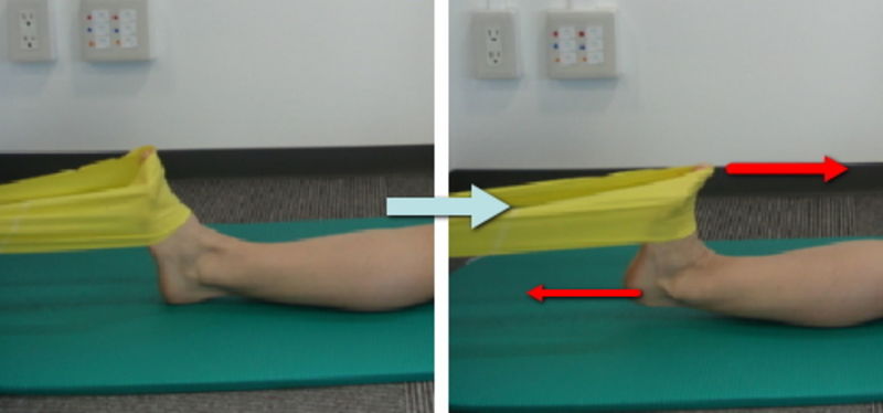 両手で握ったチューブを足の裏にかけ、つま先を伸ばすようにしチューブを押します。受傷早期では足首を伸ばしきらないように注意してください。痛みがひけ安定してきたら、最大底屈位まで下げ(足首を完全に伸ばす)、かかともしっかり動くようにしましょう。こちらも足指だけの運動とならないようにします。