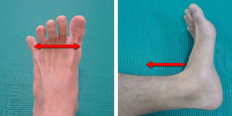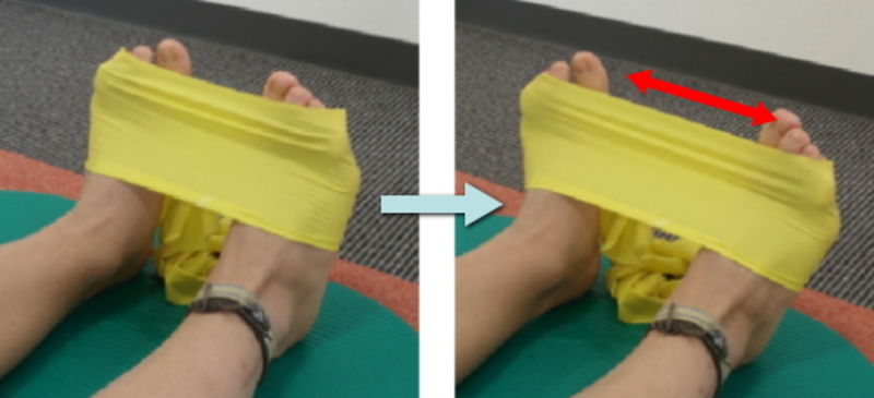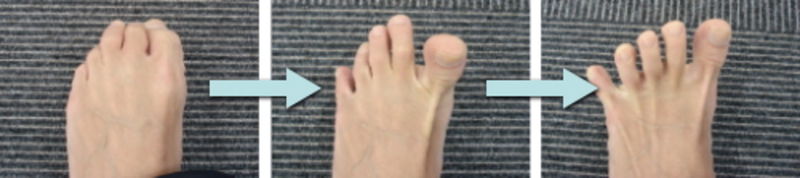 受傷後2~3日して安静時痛や熱感が治まってきたら、足関節背屈制限や腫れを吸収するために、足指の開閉と足関節背屈を行います。症状が悪化しないよう気をつけて行っていきます。さらに症状が治まってきたら下図のような足指の機能訓練に移っていきます。