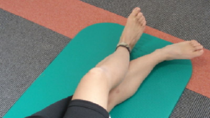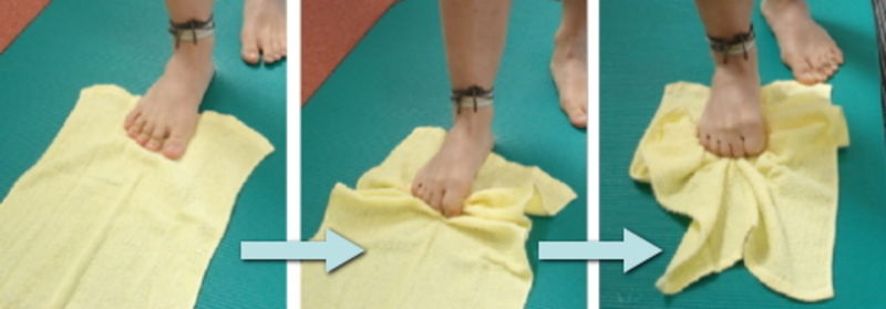 床に縦に広げたタオルを足指でつかみ手前に手繰り寄せます。一回一回しっかりとつかみ、タオルが手前まできたらまた伸ばして繰り返します。つかむことばかりに気を取られずしっかり広げるほうも意識しましょう。捻挫などで痛みのある場合はイスに座っておこないましょう。(例右10回左10回)