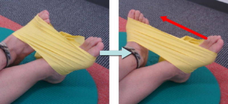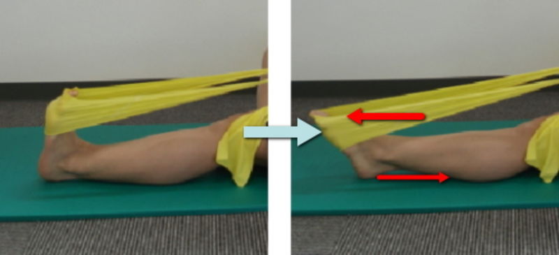 一端を机などの柱に結んだチューブを足の甲にかけ、つま先を上げる様にしチューブを引きます。この時最大背屈位まで上げ、かかともしっかり動くように注意し、足指だけの運動とならないようにします。