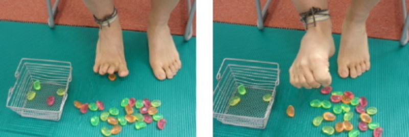 イスに座り体を安定させた状態で、おはじきをひとつづつ足指でつかんで箱に入れていきましょう。つかむことばかりに気を取られず、しっかり開いて・つかんで・しっかりはなすを行います。最初はつかみやすい親指側でつかんでもよいですが、慣れてきたら中指や小指側も使いましょう。使っていない足はしっかり地面につけておきます。片足ですべてのおはじきを箱に入れ終わってから、反対側をおこないましょう。