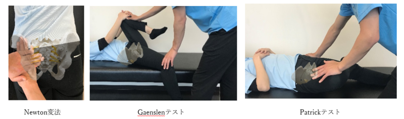 その後、片側の腰おしりの痛み(one finger test)を確認し、整形外科的テスト(Newton変法、Gaenslenテスト、Patrickテストの1つ以上が陽性)を行います。