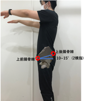 10~15°が正常と言われており、それ以上の角度(2横指以上)では骨盤前傾位、それ以下の角度(2横指未満)では骨盤後傾位と言います。