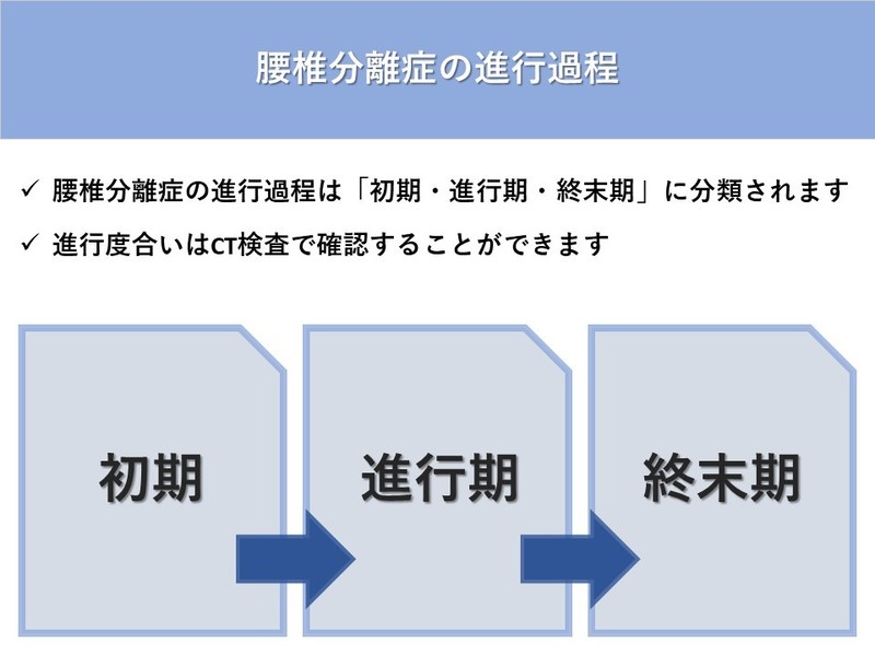腰椎分離症は、その進行具合を「初期・進行期・終末期」の3つに分類します。