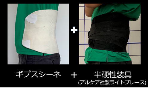 これは、ギプスシーネに半硬性装具を合わせた装具で、腰を反る動作と捻る動作を制限します。