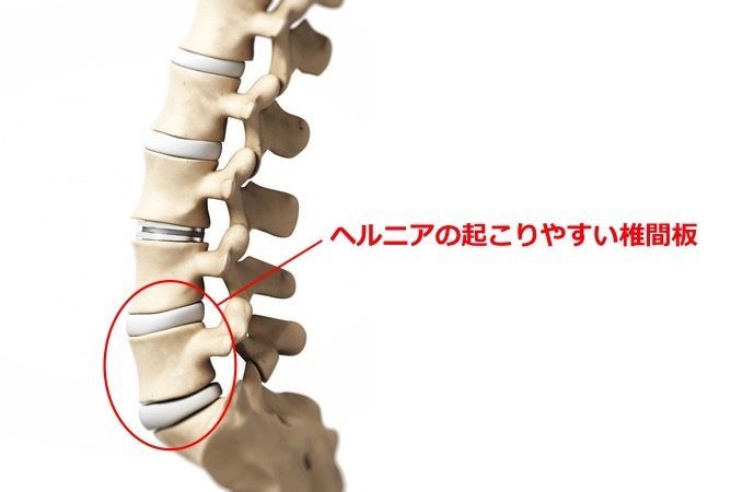 腰椎椎間板ヘルニアは、5つある腰椎の4番目と5番目の間と5番目と仙骨の間で起こりやすいです。