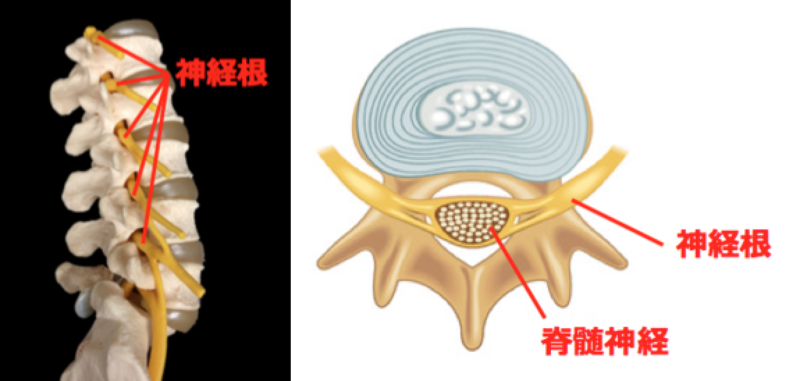 この脊髄神経から枝分かれして、上下の椎骨の間から出てきた神経を神経根と言います。