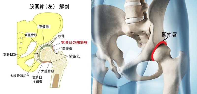 股関節は、骨盤のくぼみ(寛骨臼:かんこつきゅう)に太ももの骨(大腿骨:だいたいこつ)の頭がはまり込むような「球関節」の構造をしています。股関節唇は、その骨盤側の縁をぐるりと取り巻いている、ゴムのような弾力のある柔らかい組織(線維軟骨)です。
