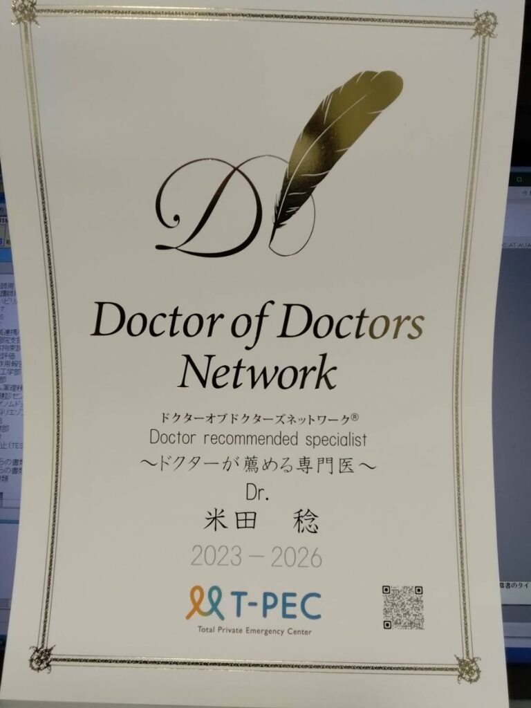米田医師は、医師同士が相互に評価し推薦する「Doctor of Doctors Network」において、ドクターが薦める専門医として認定されております。これは医療従事者からの高い信頼と評価の証です。