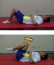 1.両膝を立て、腹圧を高めた状態でお尻を床から浮かせる