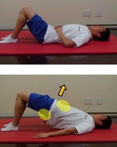 1.両膝を立て、腹圧を高めた状態でお尻を床から浮かせる