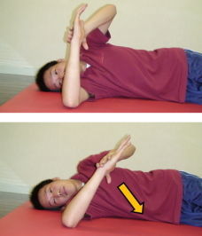 2.肩甲骨を引き寄せるように、肘を天井に向けてあげます