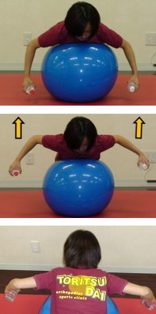 1.胸をバランスボールに当て、肘を曲げた状態で両腕を広げます