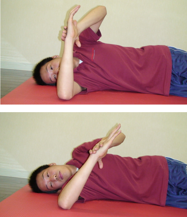 •立てた肘を手のひらを床に着けるようにゆっくりと倒していきます
