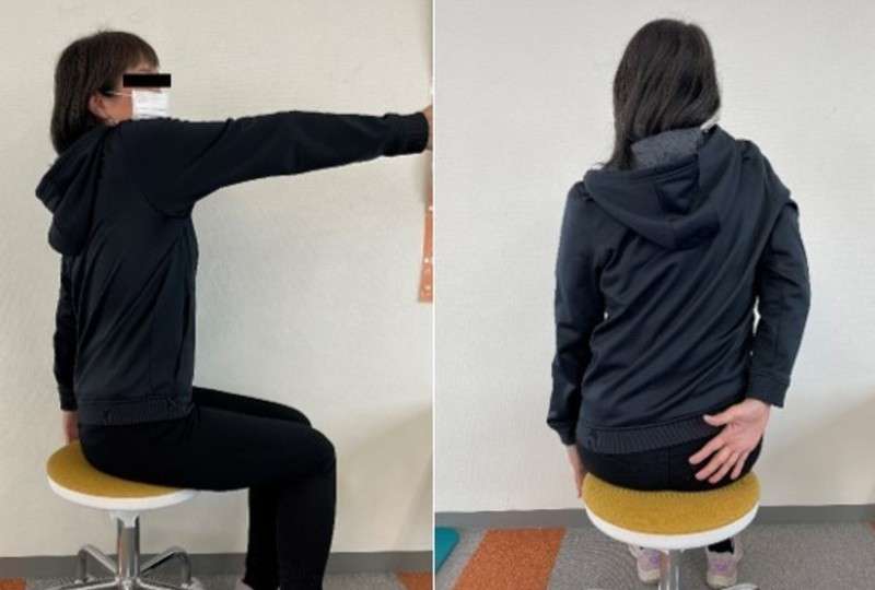 挙上動作は前へならえ、手を後ろに回す動作はお尻を触るのがやっとの状態であり、かなり動きが制限されています。