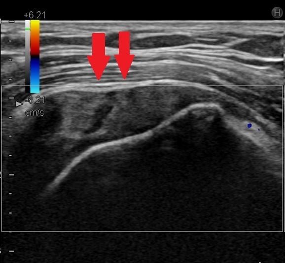 超音波画像( 赤矢印 に陥凹があり断裂を疑う)