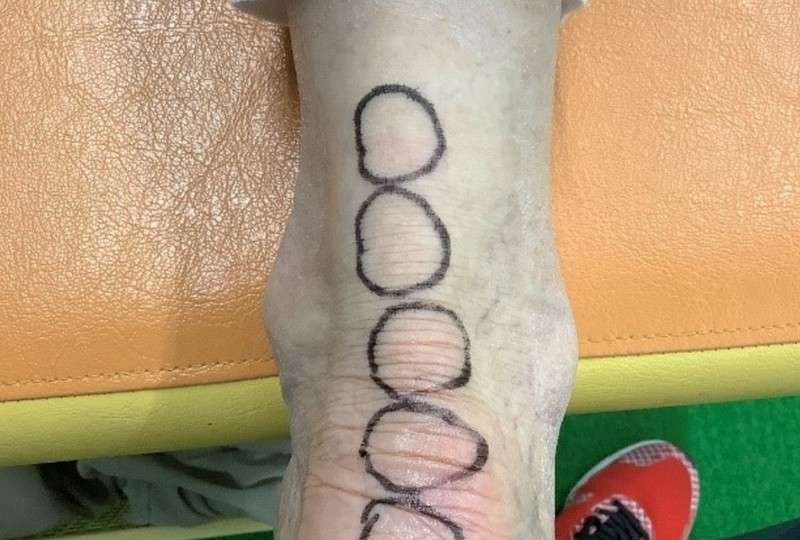 拡散型の衝撃波治療器で体外衝撃波治療を行い、黒い丸の部分に衝撃波を当てるように行いました。