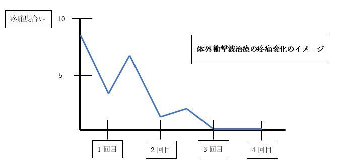 治療前はTomthenテストで痛みの度合いが7でした。実施直後に3~4に軽減し、疼痛やや戻り、実施後軽減、やや戻り...4回目には実施前の時点で1~0に改善しました。このように体外衝撃波治療は、段階的に症状が改善していきます。