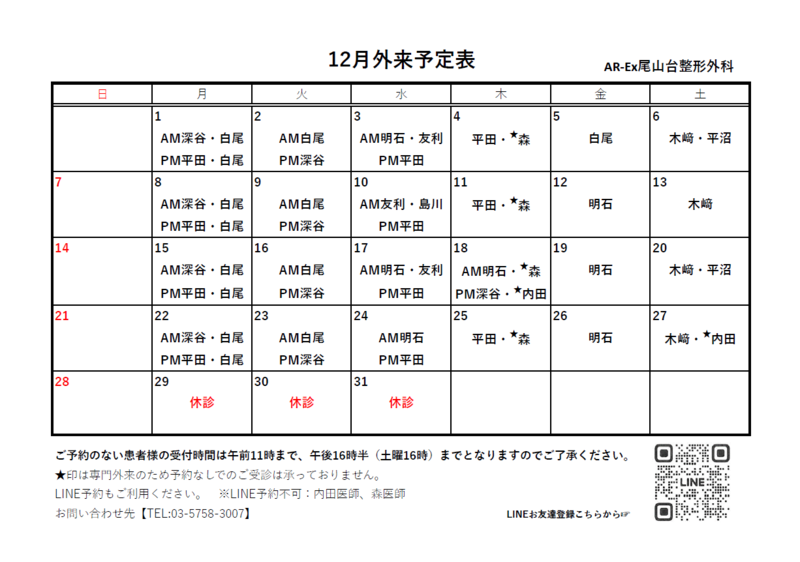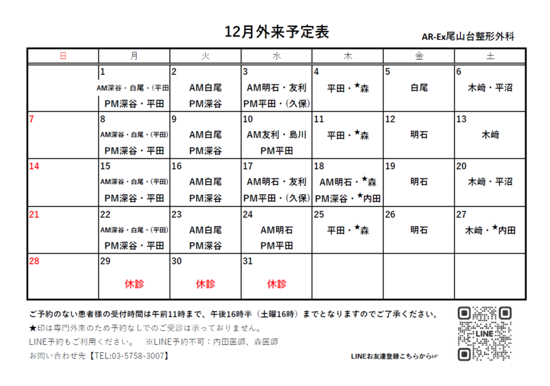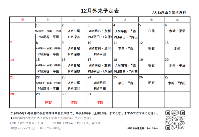 12月外来診療カレンダー