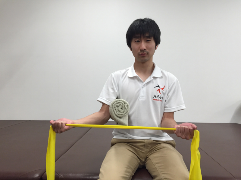 また、肩以外の部位の動きが悪く、肩への負担が増加している場合があるので、肩関節だけではなく、肩甲骨や胸郭、脊柱の可動域トレーニングを行います。