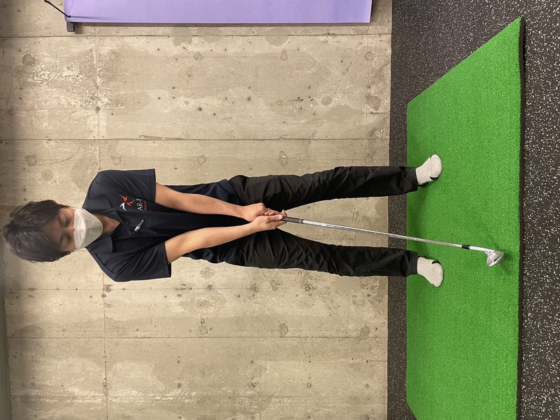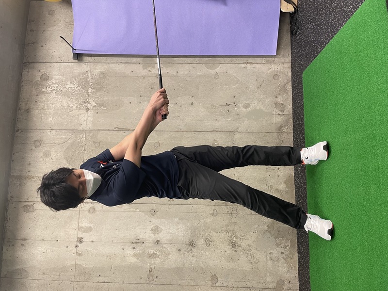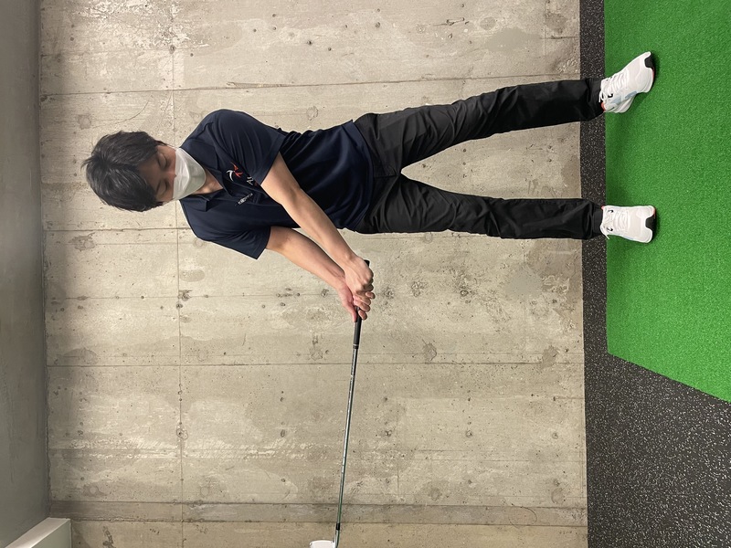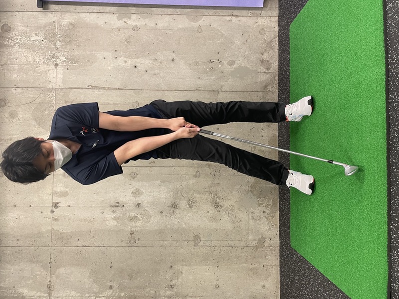 ②手を床の方に動かし肩の後ろのストレッチを行います