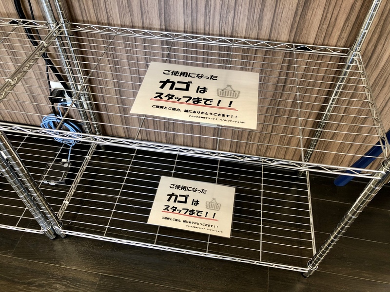 荷物を入れているカゴは患者様が使用した後消毒をしています