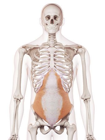 腹横筋は側腹部の筋の中で最も深層に位置する筋肉で、コルセットのように腹部から背部までを覆うように付着しています。