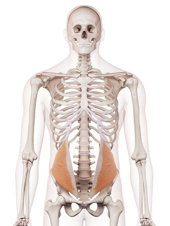 内腹斜筋は側腹部の筋で中間の深さに位置する筋肉です。身体を同じ方向に捻る筋肉なので、例えば右の内腹斜筋が働くと身体は右側に捻られることになります。