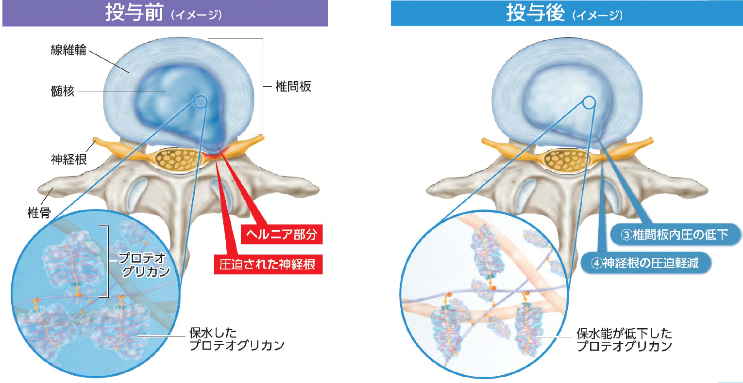 従来は腰椎椎間板ヘルニアに対する根本的な治療は手術で取り除くことしかありませんでしたが、2019年8月に「ヘルニコア」という薬が国内で保険適用になったため、注射で椎間板ヘルニアを治療することが可能となりました。「ヘルニコア」の薬液を椎間板に注入すると、椎間板内の水分量が減ることで体積が減少し、ヘルニアによる神経への圧迫が改善します。