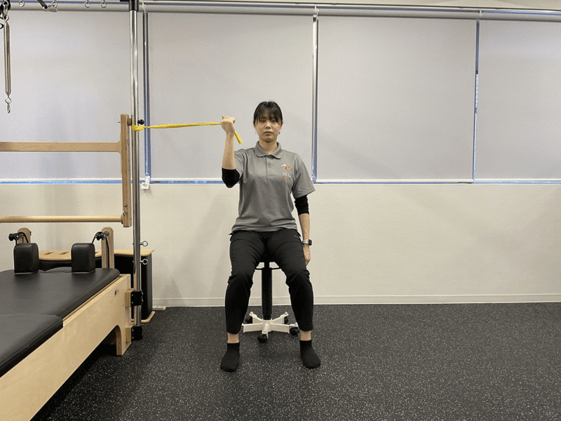 1:座位、立位もしくは臥位で肩3rd内外旋中間位のポジションをとる