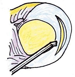 | 大きく損傷している場合は、切れている半月板をはさみでカットし、ピンセットのようなものでつまんで切除します。 | |||