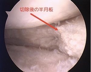 実際に半月板を切除した後の関節鏡で覗いた写真です。こうする事で、痛んだ半月板が膝の軟骨とすれる事がなくなり、軟骨の損傷の進行を抑えることが出来ます。しかし本来、半月板は存在していなくてはならないものです。切除するということは、半月板本来の機能を低下させることは否めません。 切除する場合も、必要最低限の切除にとどめ、出来るだけ半月板を残すように処置を行います。 |