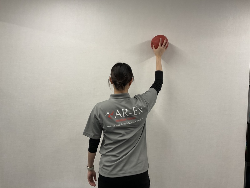 1:挙上可能な範囲まで手を上げ、ゴムボールを壁と手で挟む