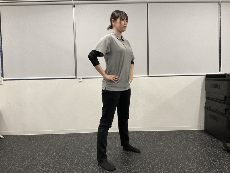 1:つま先を前に向け、足は肩幅に開いて立つ