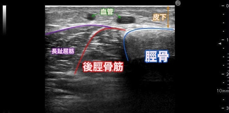 超音波では、脛骨周囲の骨膜が腫れているかを確認する事が出来ます。