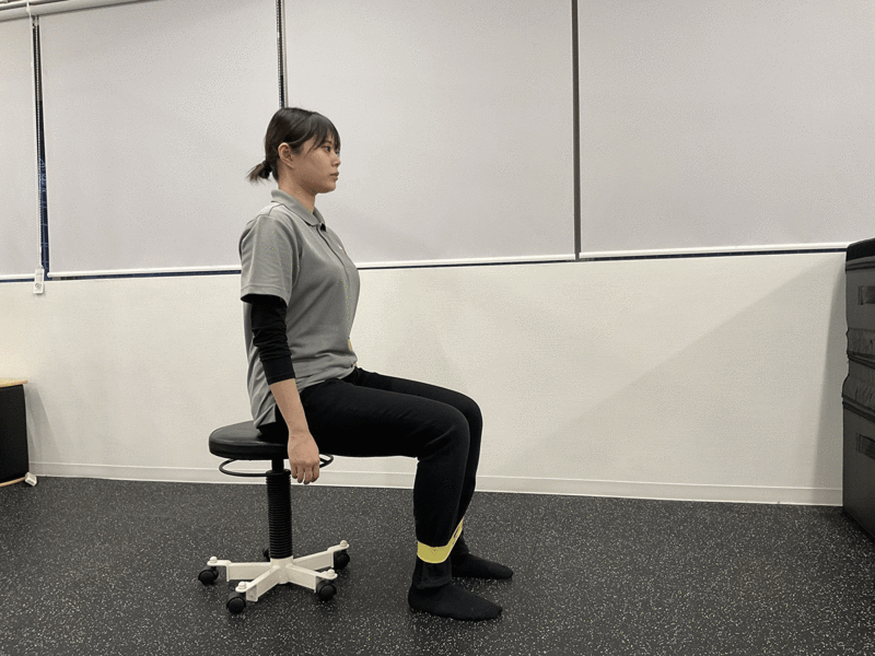 1:座位になり、足首にチューブを付ける