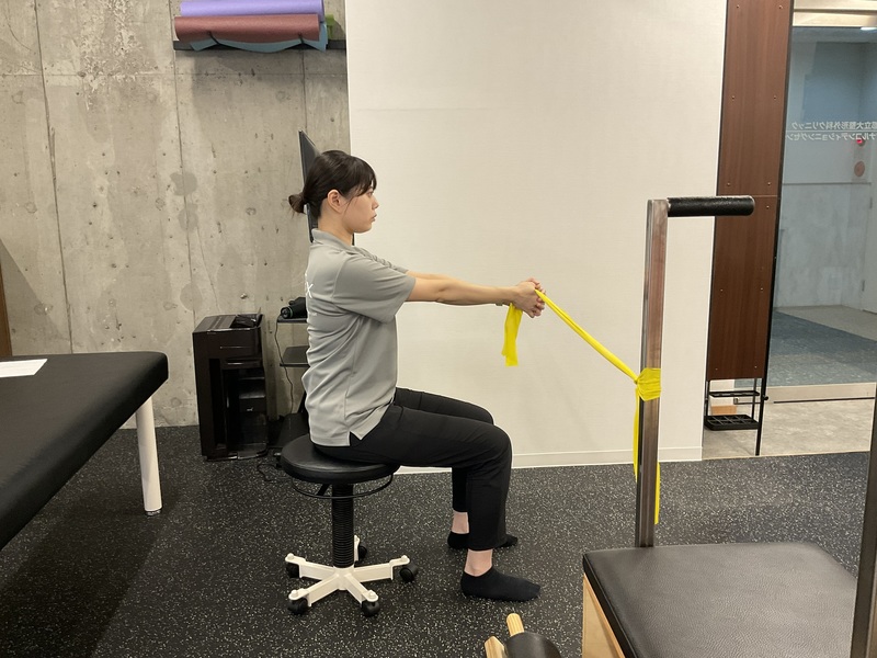 2:肩や腕の力でチューブを引っ張らず、体幹でキープする