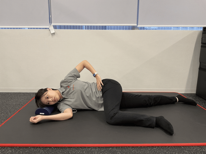 1:上側の股関節・膝関節は90°屈曲、下側は頭から足まで一直線に横向きになる