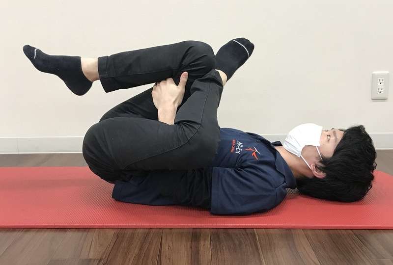 3.抱えた膝を胸に引き寄せます体を後ろに倒していきます。