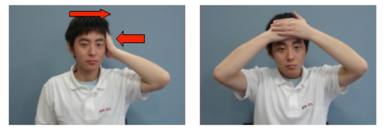 上体をよい姿勢に保ったまま、両手を額に当て、頭で押します。首が下を向いたり上を向いたりしないように。