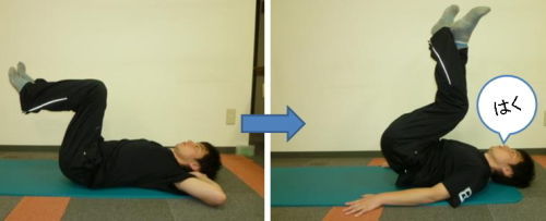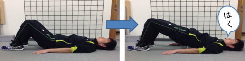 膝を立てマットにあお向けで寝ます。息をはきながら、脚と身体が一直線になるようにお尻をもち上げます。