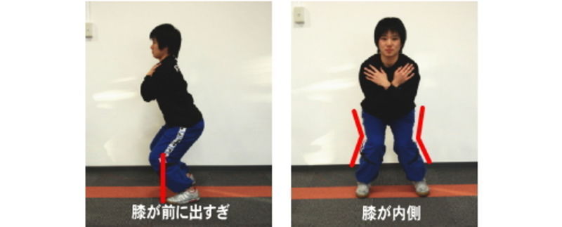 ③膝はつま先より前に出ないようにすること。膝とつま先が同じ方向に向くよう注意し、膝が内側に入らないようにします。足指は丸めたりせずしっかり伸ばし地面をとらえておきます。体の中心軸がブレないように。