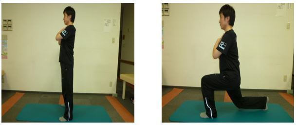 ②片足を一歩前に踏み出します。曲げている膝が90°になること、猫背にならないように注意して行いましょう。