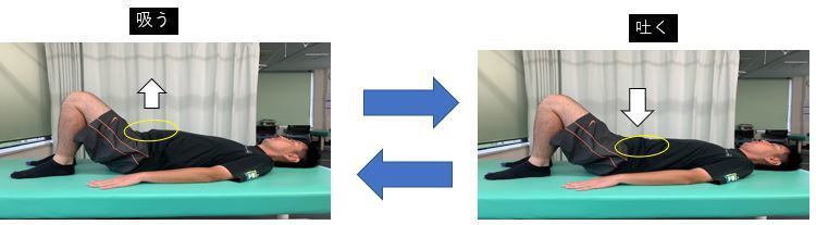 ②息を吸いながらお腹を膨らませて、息を吐きながらお腹を凹ませます。きついズボンを履く時のように!ゆっくりとした呼吸で行います。