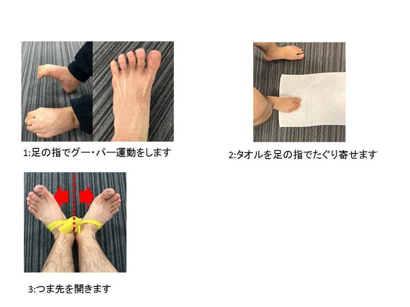 足の指でグー・パーが出来るかを確認します。できない場合は足低筋群の筋力低下を意味します。